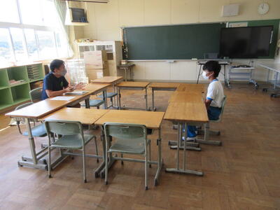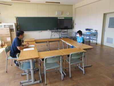 令和4年9月26日(月)、6年生が外国語の授業で、ALTの先生による英会話のテストに挑戦していました。「How are you?(元気)」「What did you enjoy this summer?(今年の夏、何を楽しみました)」「What sport do you like?(好きなスポーツは)」など、一対一で、英語のみで質問され、答えていました。少し緊張しているようにも見えましたが、しっかりと質問を理解し、答えることができ、満足そうでもありました。中学生がよく受験する実用英語技能検定では、3級以上で英会話のテストがあります。今回、とてもよい経験をしたと思います。