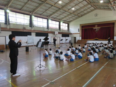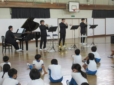 令和4年9月27日(火)、3・4年生を対象に、おでかけアリオス学校公演を開催していただきました。いわき市出身の多田さんが率いるトランペットトリオ「BRAVI TOROMBE(ブラーヴィ トロンベ)」とピアノのアンサンブルコンサートです。本校は、3日間で市内小中学校6校を回る公演の1番目でした。トランペットやピッコロ、フリューゲルホルンなど多くのトランペットの紹介とともにプロの演奏を楽しみました。曲は、ヴェルディの「凱旋(がいせん)行進曲」に始まり、ワーグナーの「第1幕への前奏曲」まで、有名クラッシック曲、子どもたちにも親しみやすい曲、多田さんのオリジナル曲と様々な種類を聴くことができました。演奏後、子どもたちからは、「金色と銀色の楽器の違いは?」「好きな楽器は?」など質問も出され、楽器に興味を持っこともできたようです。代表児童が、感想とお礼を述べ、参加児童の大きな拍手で、素晴らしい学校公演を終えることができました。いわきアリオスのこのような企画に感謝します。