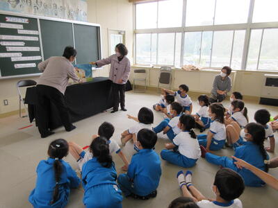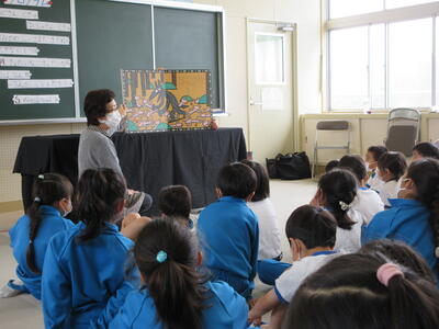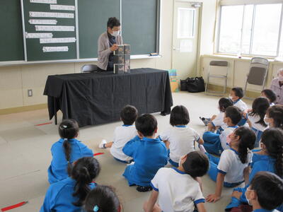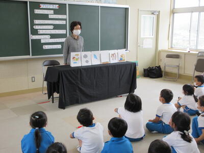 令和4年6月9日(木)、1・2年生が、出前絵本の読み聞かせを体験しました。読んでくださったのは、子どもの読書環境を豊かにする会の3名の会員の方です。