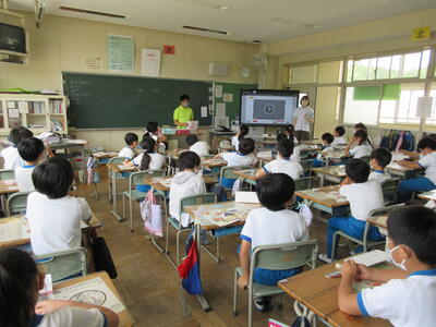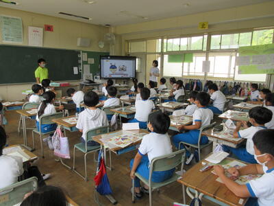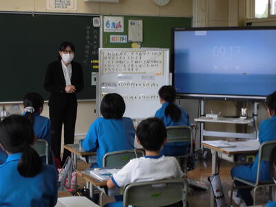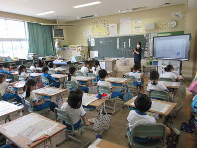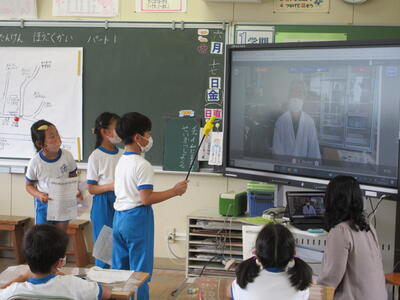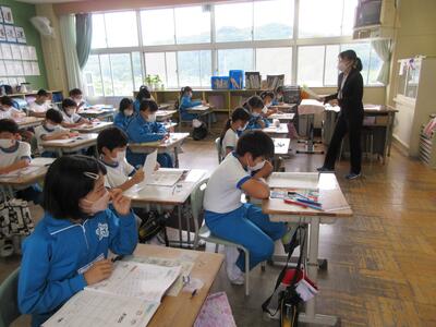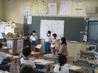 1年生は、道徳の授業「はしのうえのおおかみ」です。うさぎさんが橋を渡っていると、おおかみさんが「じゃまだ。じゃまだ。」と登場します。うさぎさん、おおかみさんの気持ちを発表しました。その人になって、気持ちを想像する力は、集団生活で大切ですね。