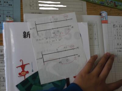 5年生は、「小数の倍」のまとめの練習問題に挑戦していました。数直線をうまく活用しながら、2量の関係に着目し、解決していました。この学習は、6年生の割合の学習につながります。
