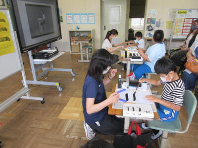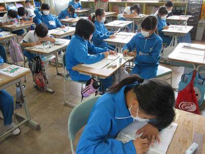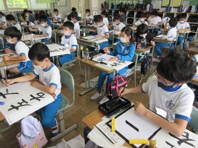 4年生は書写の授業、「左右」の文字を何度も練習していました。左と右の文字、似ているようで、筆順も字形も全く違います。勉強になります。左手と右手の象形文字だそうですが、…。練習するにつれ、自信も増し、「すごいでき!」の声が聞こえたような、…。