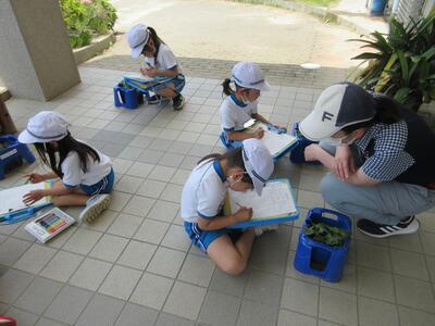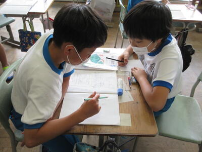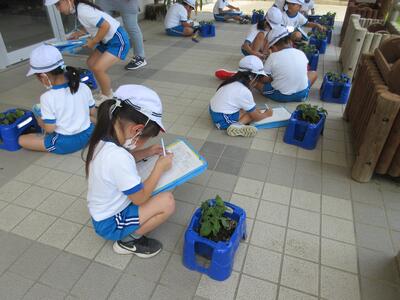 令和4年6月20日(月)、1年生は生活科の授業「大きくなったね」、育てているあさがおの観察記録です。葉の色や数について分かりやすく書きます。あさがおを絵に表し、「葉は、手のひらより大きい。…」と記録していました。なるほど具体的。