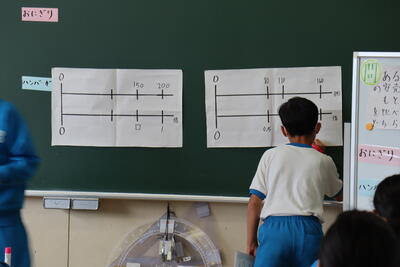 本日の授業では、児童の学習意欲を高めるため、おにぎりとハンバーガーの安売りといった日常生活と関連付けた課題としました。また、自分の考えを持てるように数直線のヒントカードを活用したり、説明できるようにペア活動を設定したりしました。今回学んだことを利用して、さらに問題に挑戦させ、できるようになったと実感させたいと思います。