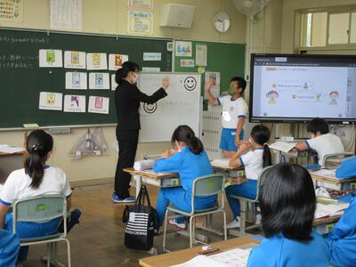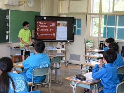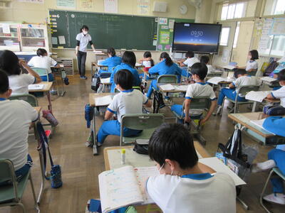 4年生は外国語の授業です。繰り返される「What time is it ?」の質問に、「It's 5 p.m. It's “Homework Time.”」…と、リズムよく答えていました。