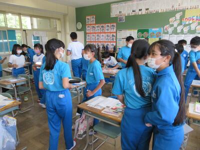 6年生は、「割合」でした。比の関係を利用し、問題を解いていました。友だちと解決方法について確かめ合うことによって、改めて自分の解き方を確認できているようです。この学習は、中学1年生の比の等式につながります。中学校でも、同じ問題を解きますが、解き方は少し変わります。