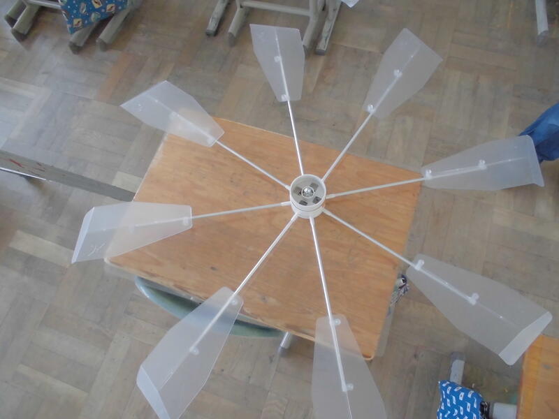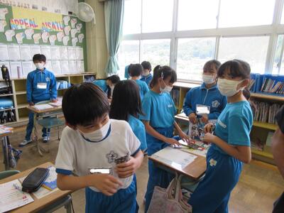 3年生は理科の授業「風の強さで物の動きは、どう変わるか」、風で動く車を組み立てていました。風を送ると、すっと動きました。再生可能エネルギーの学習にもつながるか?
