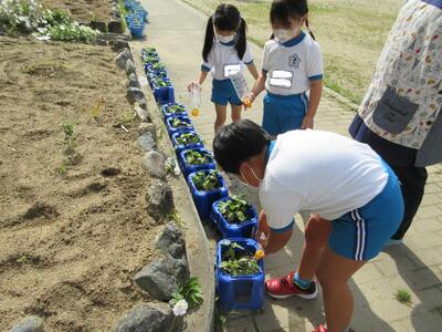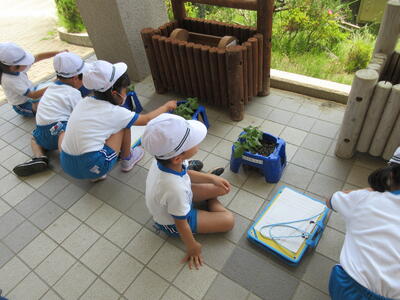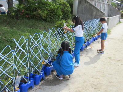 令和4年6月14日(火)、朝の日課の水やりを子どもたちがしっかりと行っています。1年生のあさがおは、本葉が増えています。つるを絡ませる支柱が届いたそうです。成長が楽しみです。2年生の野菜もぐんぐん育っています。キュウリはトゲトゲいっぱい、立派なものです。ミニトマト、ナス、オクラ、ピーマン、小さいながらもしっかりと実を付けています。水やりをしながら、「栄養をいっぱいあげるんだ。」の言葉に責任感と愛情を、「大きくなったらお裾分けする。」の言葉に優しさを、キュウリのトゲに気づくことに観察力を感じます。