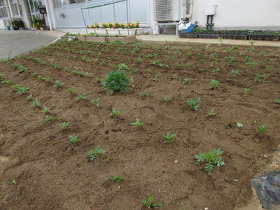 本校の用務員さんは2名おり、校地の除草や校庭・花壇の整備など行ってくれます。今週、種から苗に育てたマリーゴールドを、花壇に植えていただきました。花がある学校、すてきですね。