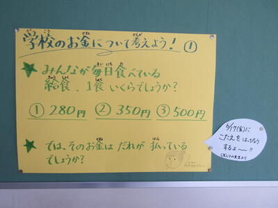 事務の先生は、授業で使う教材や備品、消耗品を、必用な時にすぐ使えるように準備してくれます。様々な集金や会計事務も行います。今回、給食費についての掲示物を作ってくれました。「みんなが毎日食べる給食は、1食いくら?誰が払っているの?」回答を知ると、給食のありがたみが実感できます。