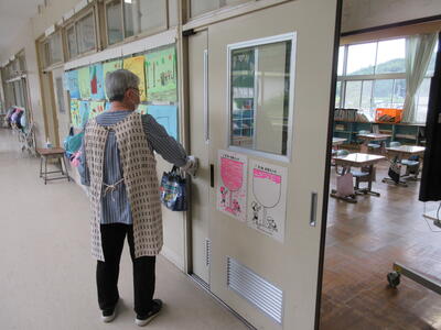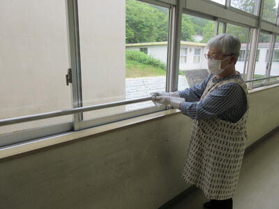 スクールサポートスタッフの方には、様々な事務の補助、校舎内の消毒をしていただいています。毎日、放課後、子どもたちが触るドア、手すり、ロッカーやトイレなどを、ハイター(主成分が次亜塩素酸ナトリウム)を薄めたものを使って消毒し、その後、水雑巾で拭き取っています。おかげで、安心・安全に生活をすることができます。