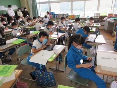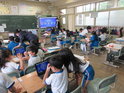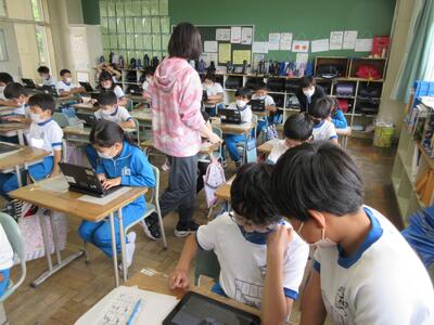 令和4年6月15日(水)、4年生は、担任の先生とICTサポーターの先生によるタブレット活用の学習でした。好きなことを調べて、こどもofficeでまとめたり、タイピング、ビスケット、スクラッチなどのソフトを体験していました。タブレットを手段として、自由に活用することによって、学習の仕方が広がり、できることが多くなりますね。