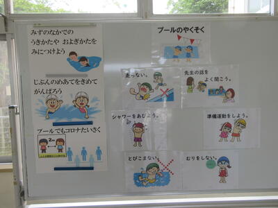いざプールへ。ホワイトボードのプールの約束、コロナ対策もしっかり確認します。保健室先の渡り廊下を通り、直接、プールまで行きます。準備運動を終え、プールの中へ。バタ足から、お決まりの流れるプールをつくり、水に十分に慣れます。「水中ジャンケン」「ジャンケンポン」、子どもたちは、とても楽しそうです。