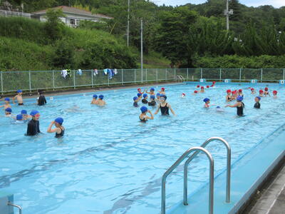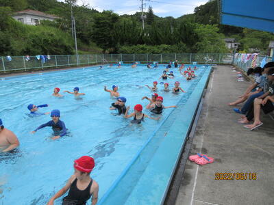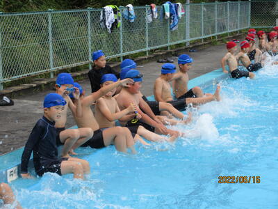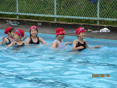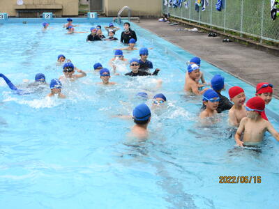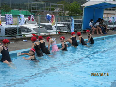 令和4年6月16日(木)、3・4年生は体育、プールの授業で校内1番目です。プールの清掃は完了、水質検査も合格でしたが、気温・水温が上がらず、プール初日が今日になりました。