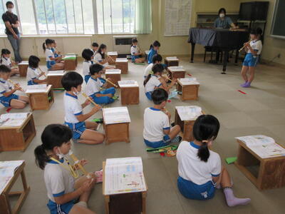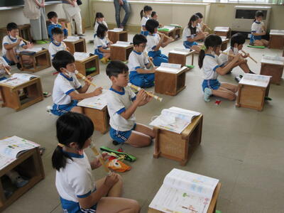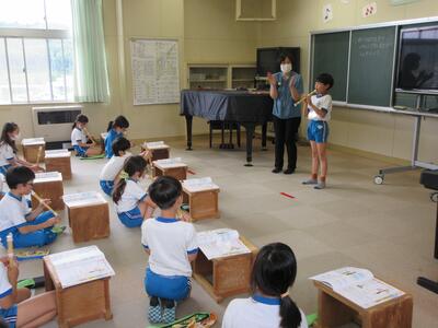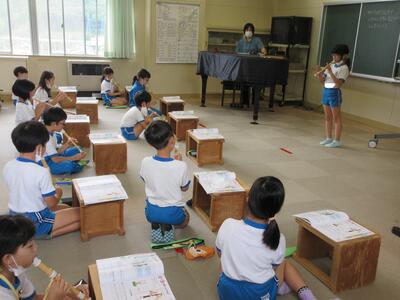 3年生は、音楽の授業「こんにちは、リコーダー」です。自分の発表した言葉に合わせて、息の吹き方に気をつけて演奏していました。「こんにちは。鬼ごっこ」「トゥートゥートゥー。トゥトゥトゥトゥ」どんどん発表が続きます。