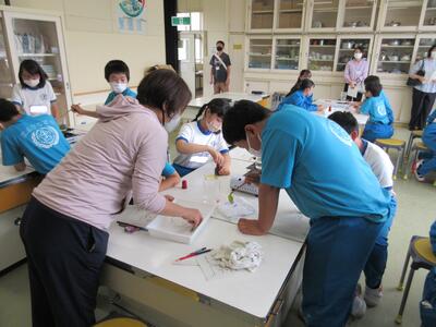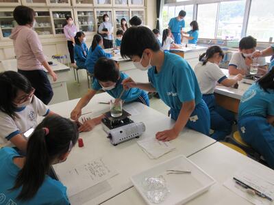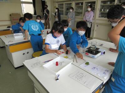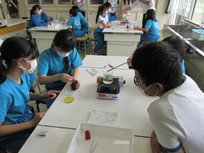 6年生は、専科と担任による理科の授業「植物の葉に日光があたるとデンプンができるか?」です。熱湯に葉を入れ柔らかくする。次に、温めたエタノールで、葉の緑を抜いて、ヨウ素液に入れると、…。子どもたちは、実験が好きです。予想を立て、確かめる。ワクワクしますね。