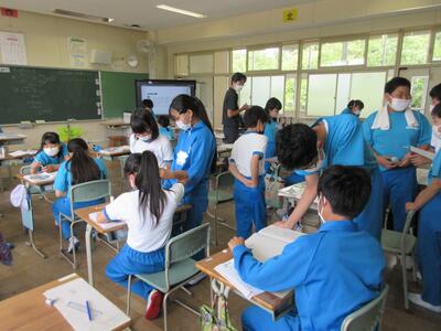 自然に英語での会話を楽しんでいました。実際に英語を話し、通じる経験は、学習意欲につながります。なお、各チームごと話し合い、該当する人を2名、しっかりと当てることができました。