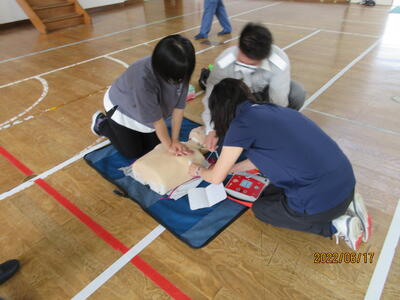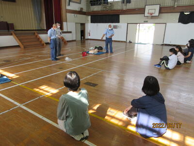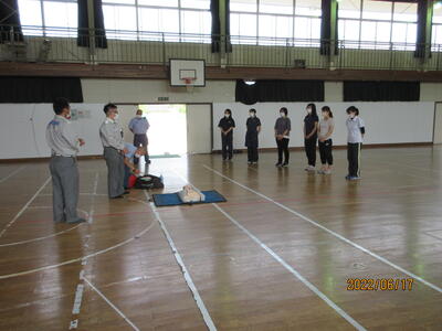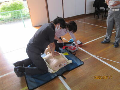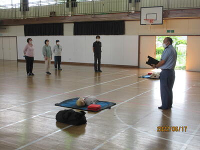 2022年6月21日 12時35分令和4年6月17日(金)、常磐消防署遠野分遣所の署員の方4名を講師に招き、職員向けに心臓マッサージとAEDの講習会を開催しました。水泳中のトラブルなど、具体的なケースを想定し、実践的な講習会とすることができました。今回は、事務の先生や支援員の先生、用務員さんも加わり、上遠野小学校に関わる職員の多くが、もしもに備えて対応できるように練習しました。