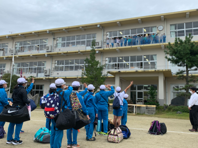 さあ、いよいよ宿泊活動が始まります。6年生がお見送りしてくれました!