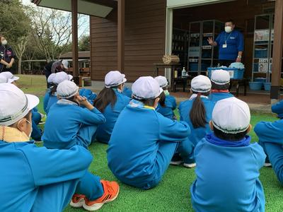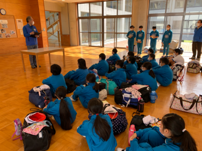 「退所のつどい」の様子です。いよいよ海浜自然の家ともお別れです!(児童の前に立たれている所員の先生は、児童が入学したときの校長先生です。)