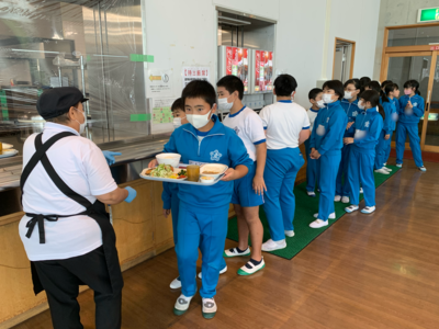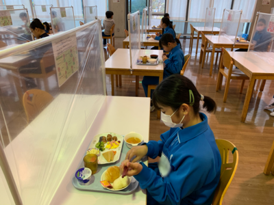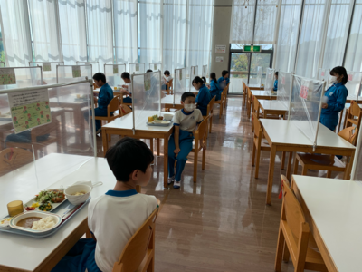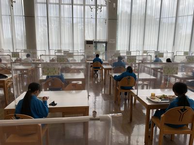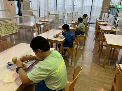 お楽しみ、昼食の時間です。ソーシャルディスタンスを確保するように工夫されていました。