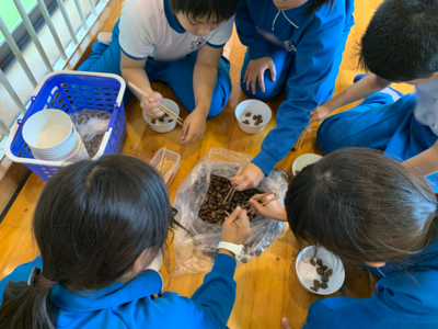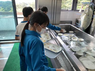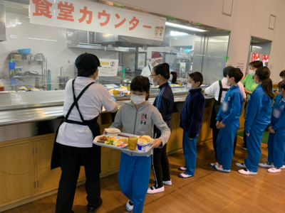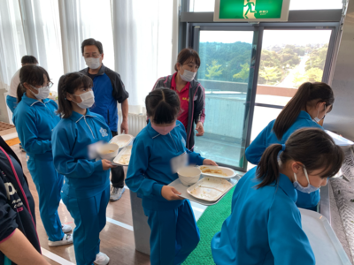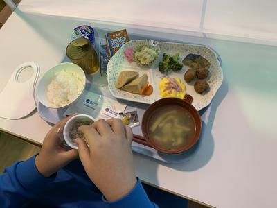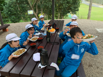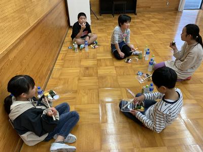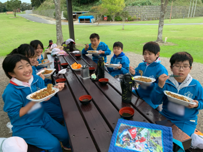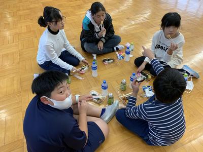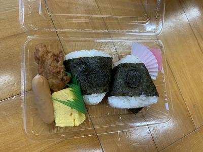 昼食はおにぎり弁当です。海岸で食べる予定でしたが、風が強かったので自然の家に戻っていただきました。