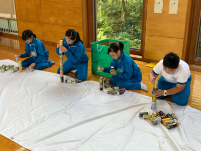 「海浜何でもチャンピオン」一10個のゲームに班ごとに取り組みます。万歩計カウント、空き缶積み、木の棒でバランスなど楽しそうなゲームがたくさんあります。