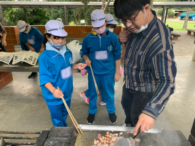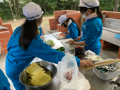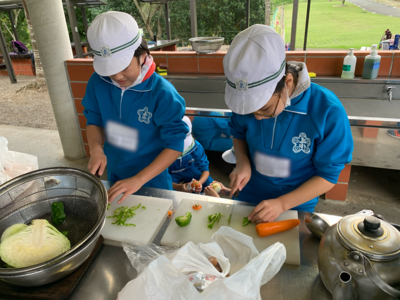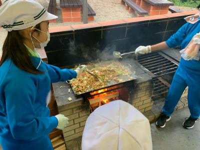 今日の夕食はポーク焼きそばです。火おこし、野菜切り、調理などいろいろと苦労しましたが、みんなで頑張りました!