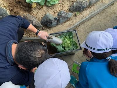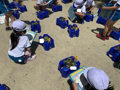 1年生は、喜んで観察カードに絵をかいていました。花が咲くのが楽しみですね!