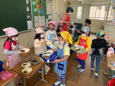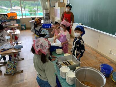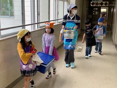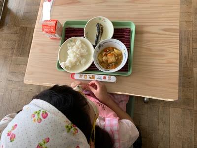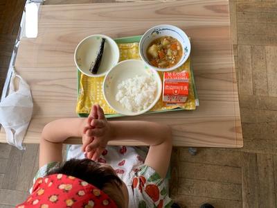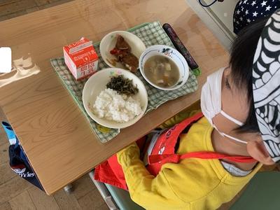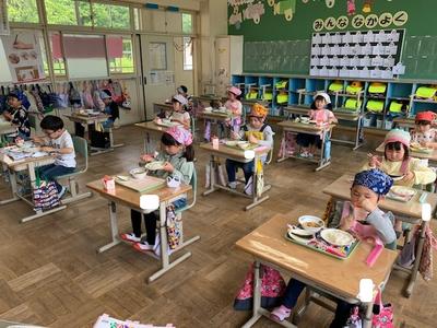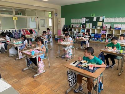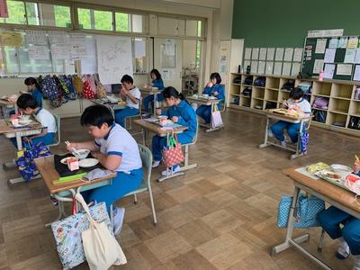 給食は、マイエプロン、ランチョンマット持参です。感染リスクをできるだけ減らすための措置ですが、早速ご準備いただきありがとうございました!子どもたちにとって、38日ぶりの給食です。食事中は友達とお話できませんが「おいしい!」と喜んで給食をいただいていました。