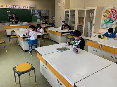 (3枚目の写真で担任が使っているのは「実物投影機」です。自席にいて、担任の手元を見ることができます。)