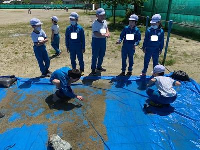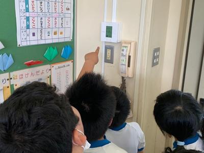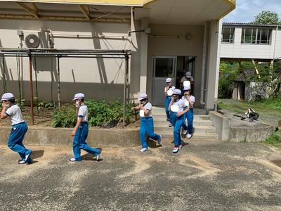 避難場所(校庭南側・鉄棒前)が密にならないように、一斉避難ではなく、あすかい学級、1年生から順番に避難して、教頭先生に人数を報告したらすぐ教室に戻るというやり方で実施しました。