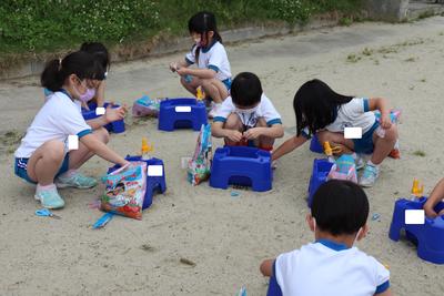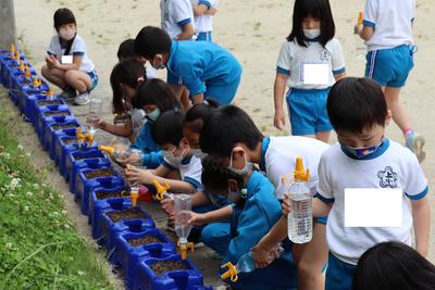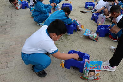 今日は1年生がアサガオの種をまいていました。大休憩にはいつも通り、ほとんどの子どもが外遊びを楽しんでいました。みんな元気ですね!