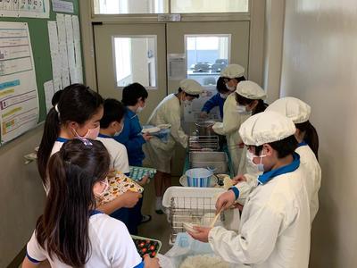 2つめは6年生の給食配膳です。休業前は教室内で行っていましたが、教室での一人一人のスペースを少しでも広く確保するため、こちらも廊下にて配膳しています。