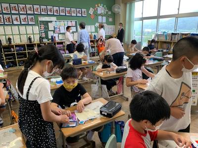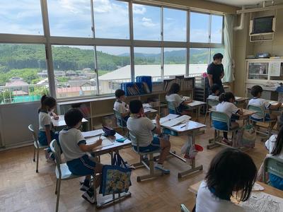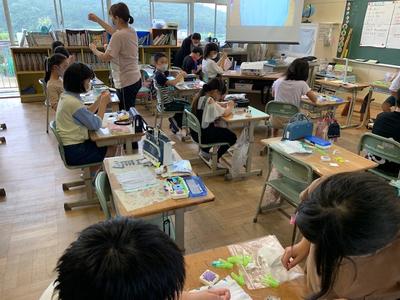 1年生はひらがなをていねいに書いていました。4年生はヘチマの苗をじっくり観察しノートに写していました。5年生は立体の体積を求めていました。