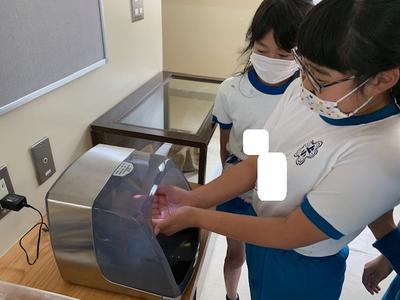 先日は5年保護者の飯塚様より、人感センサー付き手指消毒器をいただきました。こちらは、本校の来客用玄関にセットしました。こちらから何も言わなくてもお客様が進んで手指を消毒しています。