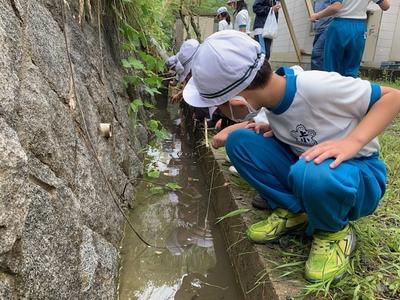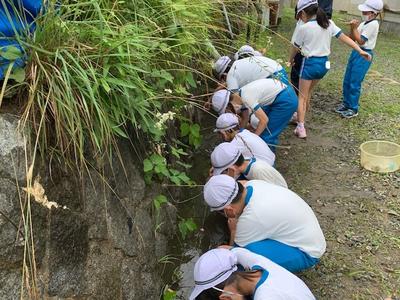 2年生が生活科「生き物をかおう」の学習で、校舎裏水路にてザリガニ釣りを行いました。