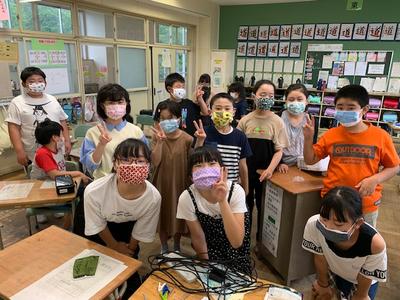 ミシンは、なかなか思う通りには動いてくれず、苦戦する子どもたちも結構いましたが、早くできた児童がヘルプに入ってくれて何とか全員完成!早速顔にかけた子どもたちは、とても満足そうでした!