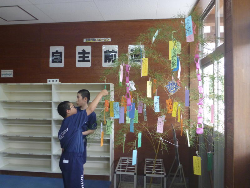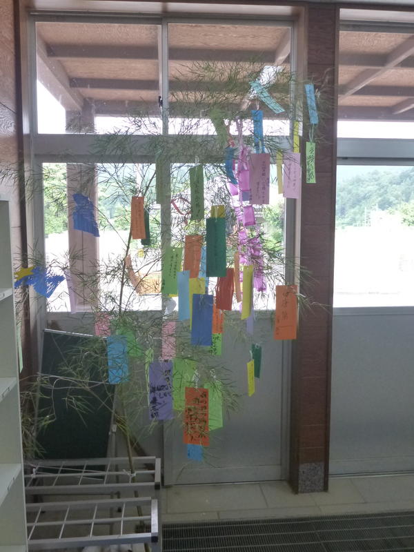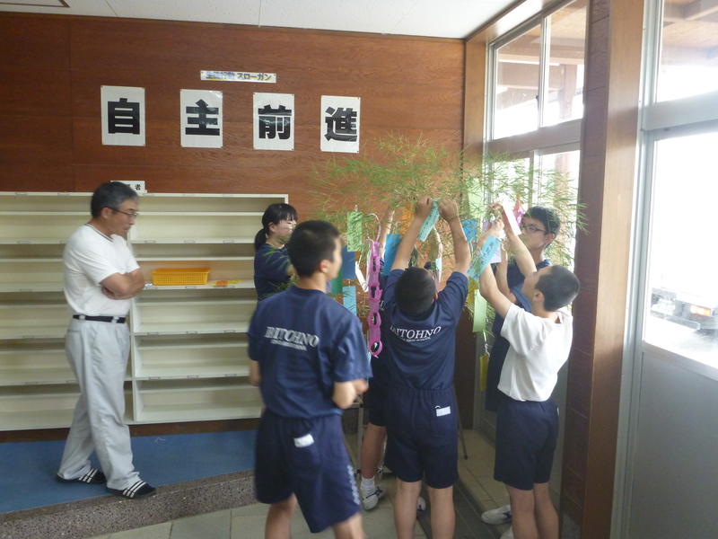 昇降口には、全校生が短冊に願いを込めた七夕飾りがあります。笹竹は用務員さんが生徒のために準備してくれました。生徒の中には、「もう一ついいですか?」と、たくさんの願いを書く人もいます。欲張り?と思いきや、たくさんの願い事のうち、一つ以外は全部他の人のための願い事でした。「友達が〇〇できるようになりますように」「〇〇の病気が治りますように」