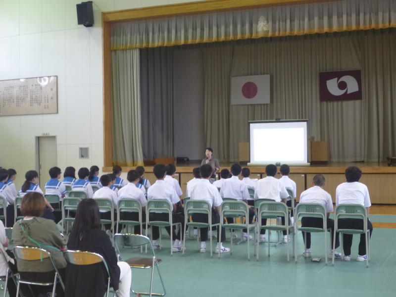 始めにお話しいただいたことは、「入遠野中学校はとても食べ残しが少ない!」ということでした。そして、めったに見られない給食センターの中のお話、栄養・運動・睡眠のお話など、食を中心とした生活の話をたくさんしていただきました。後半はクイズ形式で話の内容を確認。生徒たちは楽しみながら学ぶことができました。最後の質問も、どんどん手を挙げ「いい質問ですね~」と褒められていました。50分が短く感じる、充実した講話でした。先生、ありがとうございました。