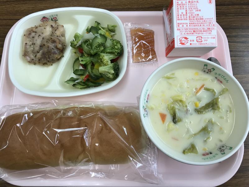 コッペパン 牛乳 福島県産ももジャム ハニーマスタードチキン フレンチサラダ キャベツとコーンのクリームスープ 811キロカロリー