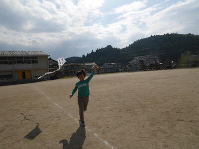 外に出て、凧あげスタートです。でも、今日は風がなくて、なかなか高くあがりません・・・。
