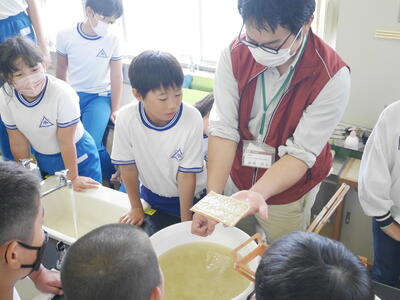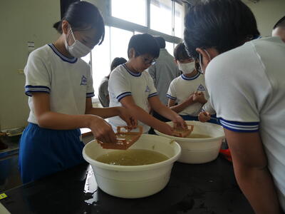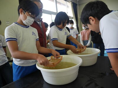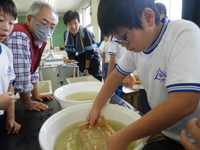 紙すきのやり方を教えてもらったら、実際にやってみます。