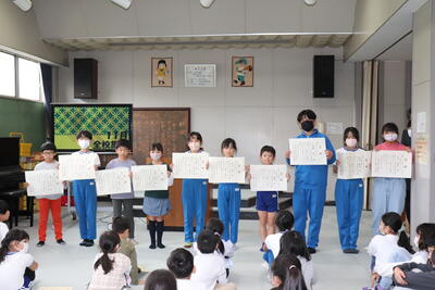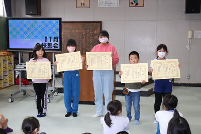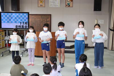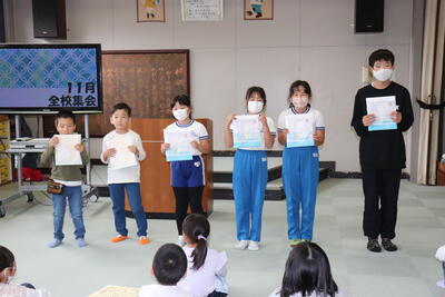 昨日の全校集会で表彰を行いました。遠野町の標語とポスターのコンクール入賞者です。