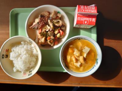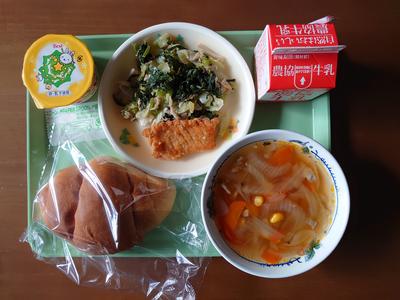 2020年12月17日 11時39分バターロールパン、フライドチキン、小松菜とエリンギのソテー、オニオンスープ、クリスマスカップデザート、牛乳です。一足早いメリークリスマスだそうです。子ども達の喜ぶ顔が浮かびます。