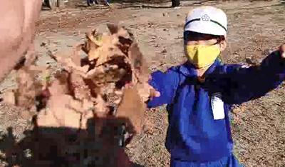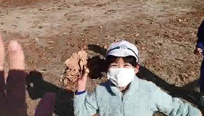 それぞれに得意な跳び方があって、なかなか決着がつきません。公園では一年生が教頭先生に遊んでもらっていました。それを見に行くと、突然枯れ葉の投げ合いバトルが勃発です。