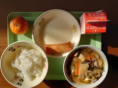 2020年12月18日 11時28分野菜春巻き、ミカン付きです。白菜は寒さが厳しくなると、自分の身を守るために体に糖質を蓄えるため、甘みが増すそうです。なんだか冬眠前にたくさん食べて太っておく熊みたいですね。でも、人間もそれにならって食べ過ぎると、運動量の減る冬期間は太りやすくなりますから、十分にご注意を!
