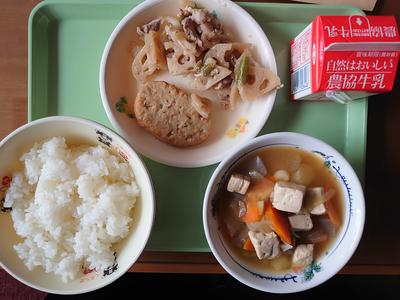 2020年12月14日 11時37分鶏つくね、醤油けんちん汁です。レンコンは先が見えるということで縁起物です。お正月にもいただくと思います。食物繊維も豊富です。なによりも、泥の中で育っているのに、きれいな色をしているところが素敵です。人間もこうありたいものです。