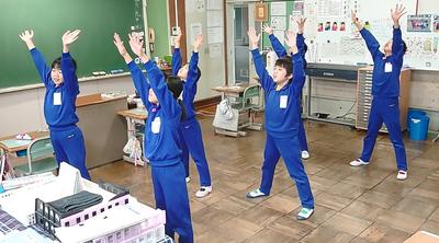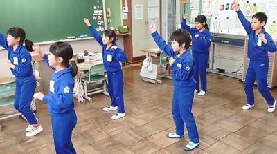 2020年12月9日 10時15分はいっ、キレッキレです。3・4年生が朝自習(?)の時間にダンスを踊っています。軽快な音楽に乗って、いろいろな動きをしています。全身に血がめぐって、頭も活性化されるとよいですね。