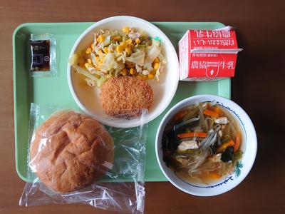 2020年12月10日 11時43分バーガーパン、メンチカツ、パックソース、ツナとキャベツのソテー、春雨スープ。バランスよい献立にしたので、おいしく食べてくださいとのことです。